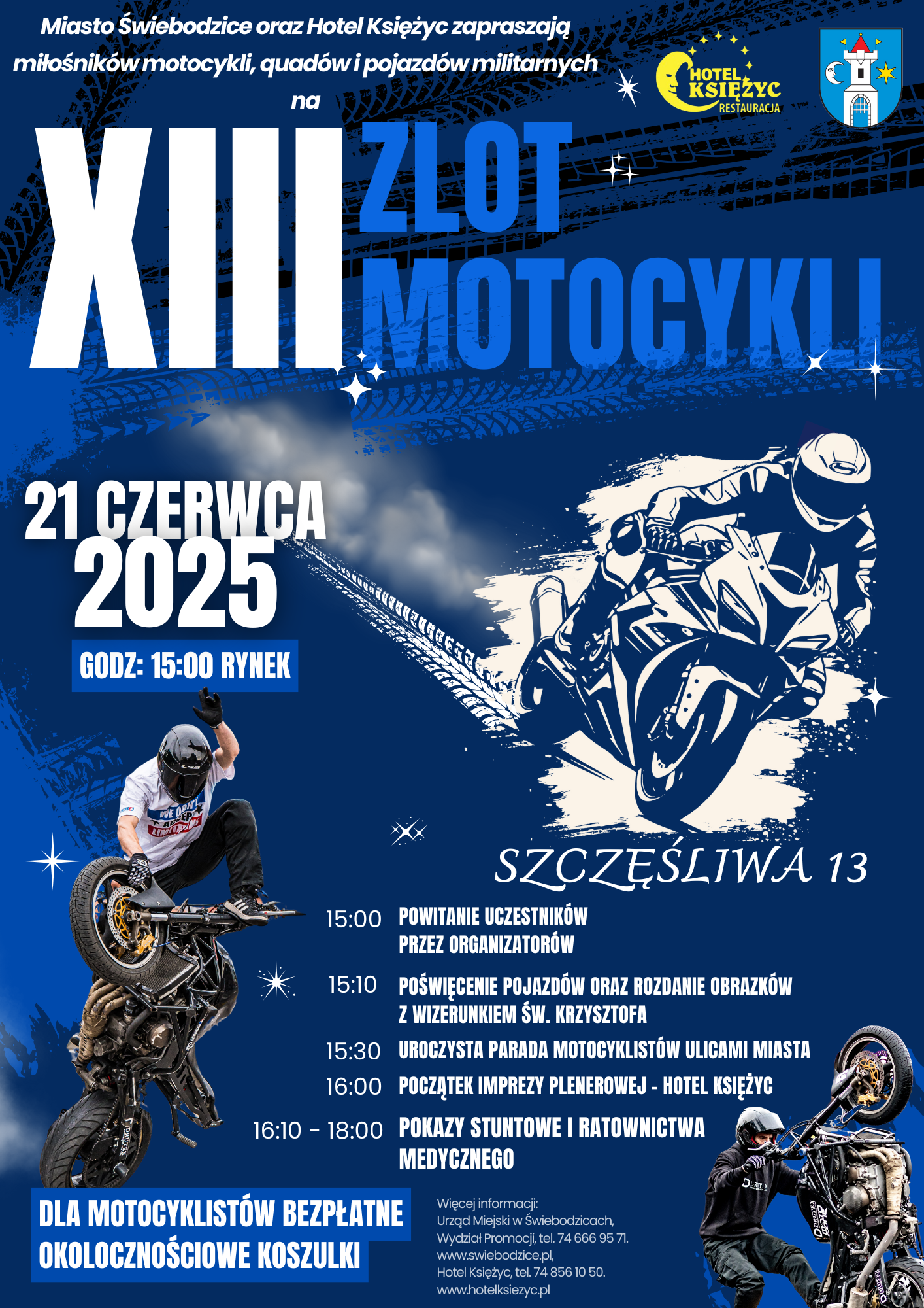 Już w tę sobotę, 21 czerwca, zapraszamy na wyjątkowe wydarzenie – XIII Zlot Motocykli w Świebodzicach! Startujemy o godz. 15:00 na Rynku a około 15:30 wyruszy parada motocykli ulicami miasta.