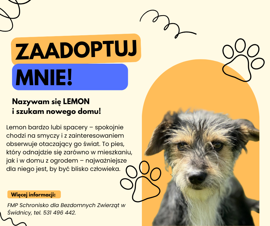 Do Świdnickiego schroniska trafił razem ze swoim psim towarzyszem po tym, jak oboje zostali porzuceni. Mimo trudnych doświadczeń Lemon nie stracił zaufania do człowieka. Od pierwszych chwil daje się poznać jako pies łagodny, serdeczny i niezwykle przywiązujący się do opiekunów. Uwielbia bliskość, głaskanie i każdy moment spędzony z człowiekiem.