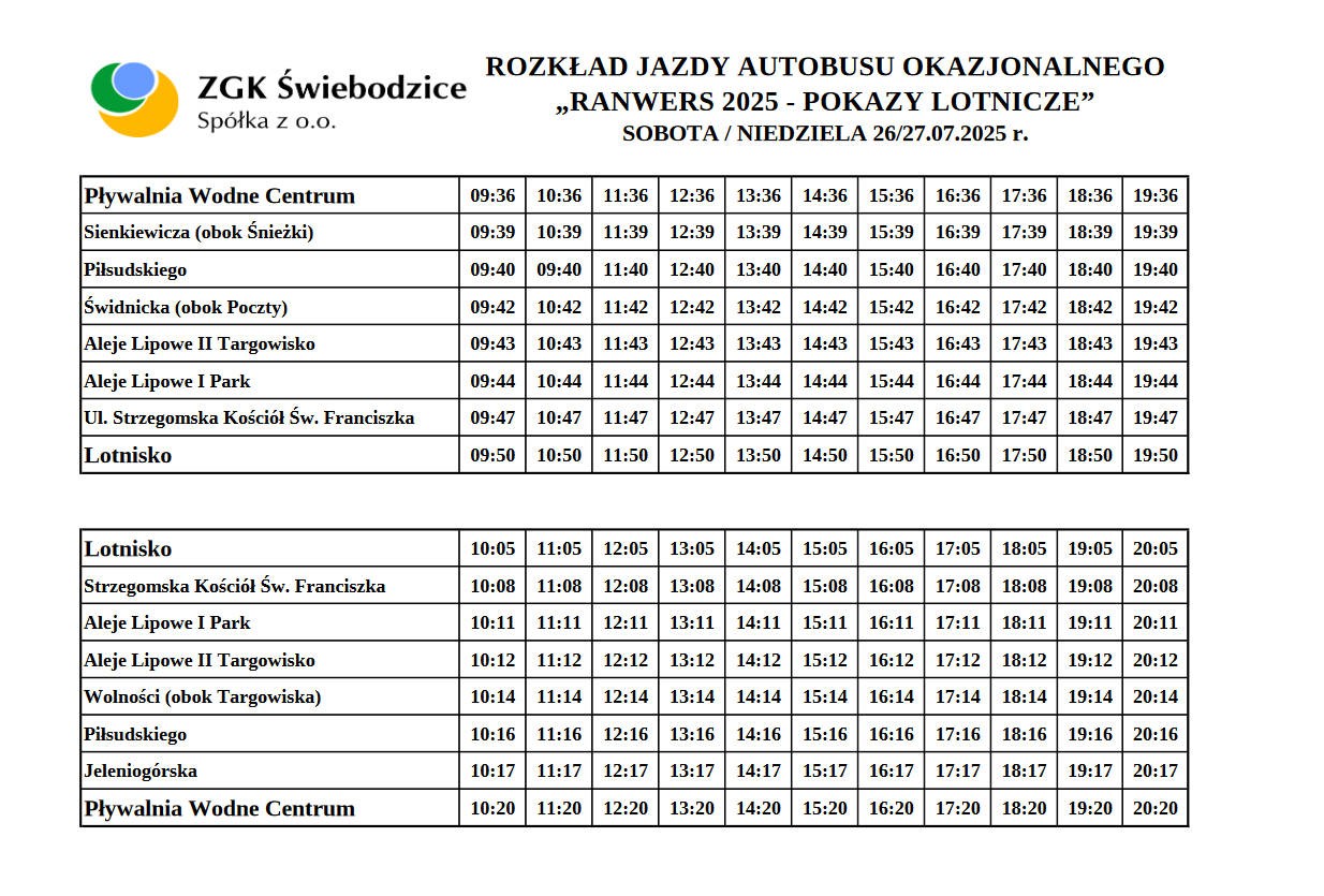 ROZKŁAD JAZDY AUTOBUSU OKAZJONALNEGO „RANWERS 2025 – POKAZY LOTNICZE”