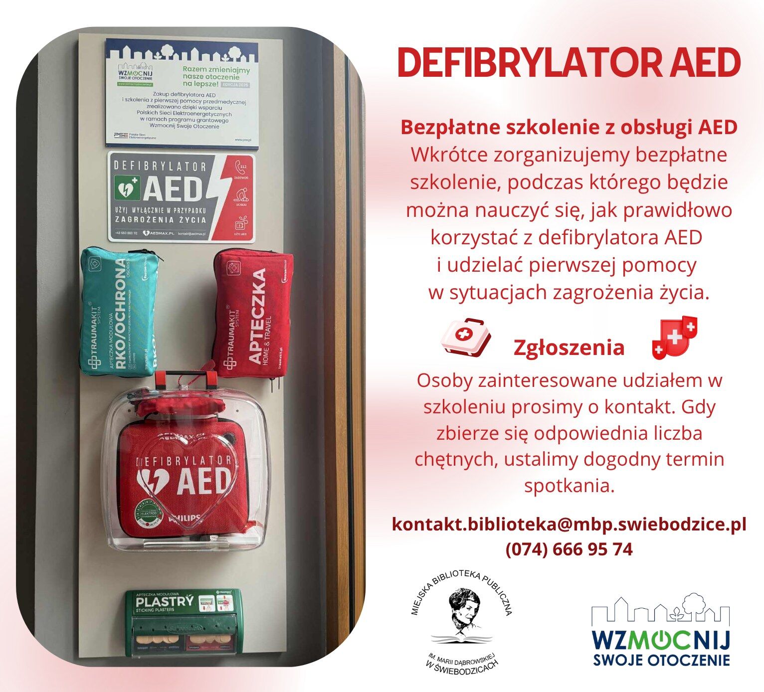 - To ważny krok w kierunku zwiększenia bezpieczeństwa naszej społeczności. Dbajmy wspólnie o bezpieczeństwo – wiedza ratuje życie! Oferujemy możliwość przeszkolenia! Serdecznie zapraszamy do udziału w szkoleniu z obsługi defibrylatora AED, które odbędzie się w naszej bibliotece – informuje Beata Majewska, Dyrektor Miejskiej Biblioteki Publicznej.
