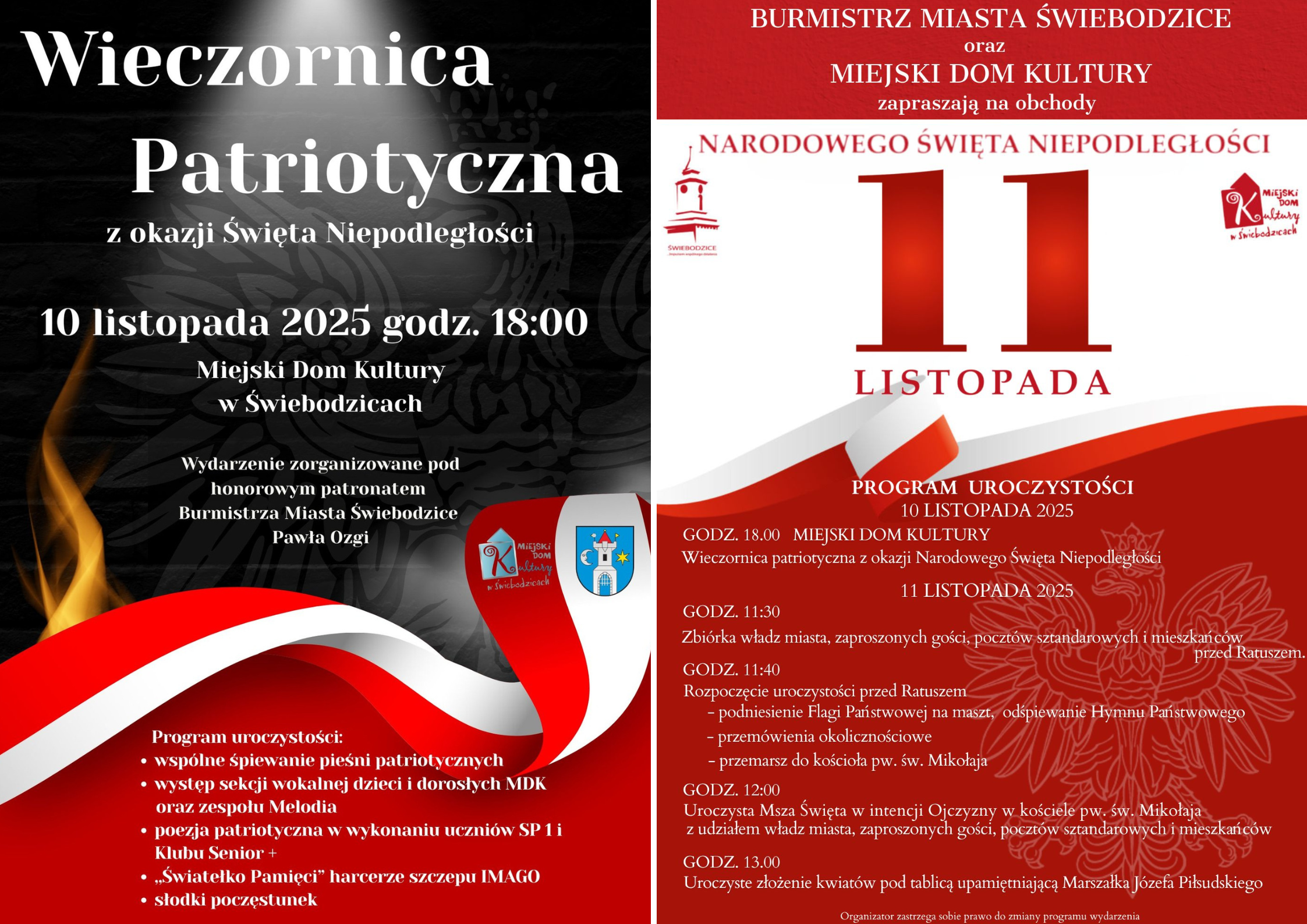 11 listopada uroczyste obchody rozpoczną się o godzinie 11.30 na świebodzickim Rynku gdzie nastąpi podniesienie flagi państwowej na maszt oraz odśpiewanie Hymnu Państwowego. Następnie uczestnicy spotkania przejdą w uroczystym przemarszu do Kościoła pw. Św. Mikołaja w Świebodzicach, gdzie odbędzie się Msza Św. za Ojczyznę, a po niej uroczystości patriotyczne pod płytą upamiętniającą Marszałka Józefa Piłsudskiego.