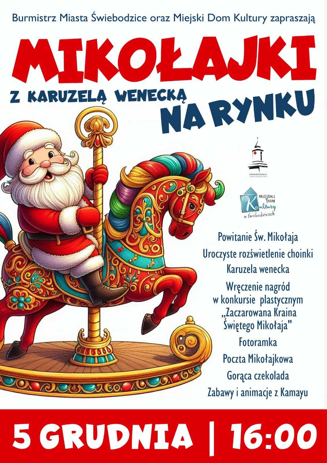 Tego dnia czeka nas mnóstwo atrakcji! Głównym punktem programu będzie z pewnością powitanie Świętego Mikołaja, który specjalnie przyjedzie, by spotkać się z dziećmi, odebrać listy i rozdać odrobinę świątecznej radości. Razem z nim przeżyjemy uroczyste rozświetlenie choinki – magiczny moment, kiedy miejskie drzewko rozbłyśnie tysiącem światełek, oficjalnie inaugurując świąteczny czas w Świebodzicach. Nie zabraknie również wyjątkowej karuzeli weneckiej, która przeniesie wszystkich, dużych i małych, do świata elegancji i bajki, oferując radosne przejażdżki w świątecznym rytmie. Z myślą o wszystkich mieszkańcach miasta przygotowana zostanie także fotoramka, czyli specjalnie zaaranżowana sceneria, idealna do zrobienia pięknych, rodzinnych zdjęć oraz Poczta Mikołajkowa, aby każde, nawet najskrytsze życzenie, bezpiecznie dotarło do Laponii. Dodatkowo, uhonorujemy młodych artystów poprzez wręczenie nagród w konkursie plastycznym „Zaczarowana Kraina Świętego Mikołaja”. O ciepłą atmosferę zadba pyszna, rozgrzewająca gorąca czekolada, a o energię i uśmiechy – animatorzy z Kamayu.